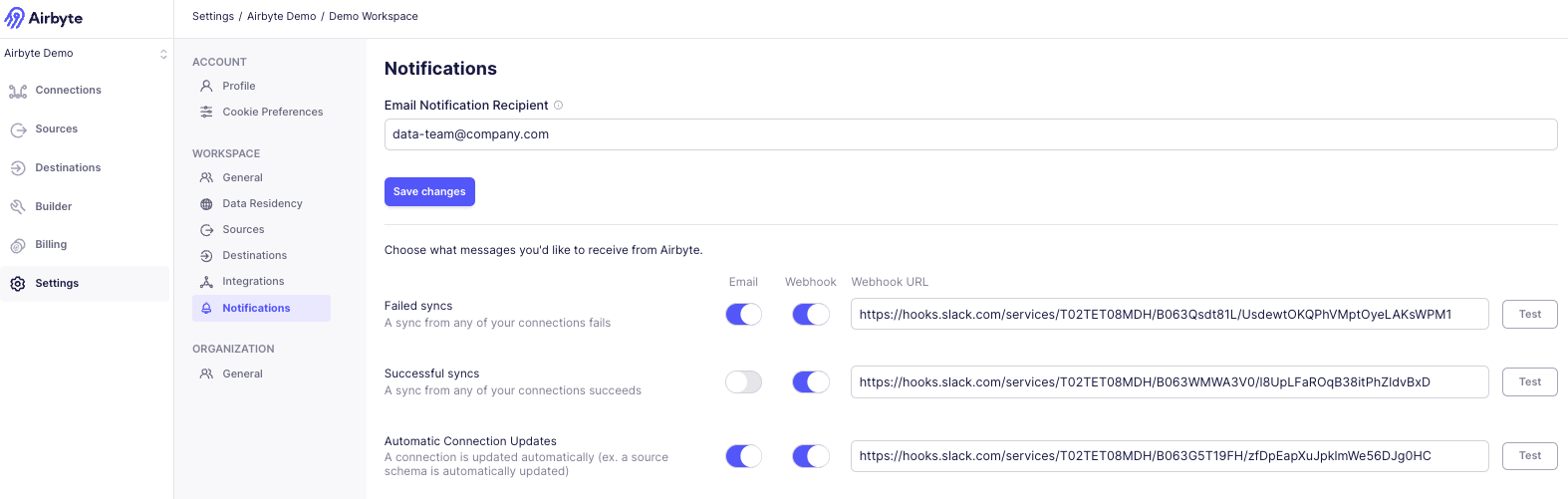 1. Click Save changes to ensure you continue to receive alerts about your Airbyte syncs.